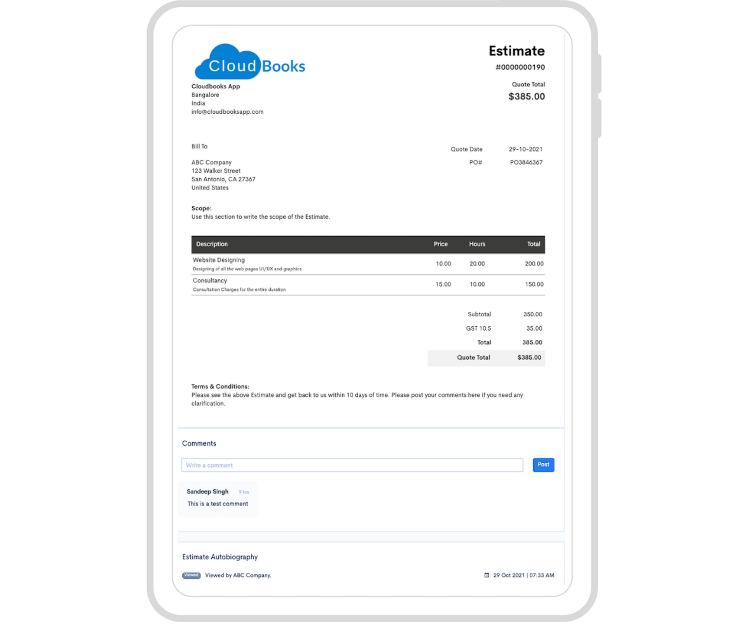 With CloudBooks, you can convert your Estimates to Invoices with a button click once they are accepted by your Clients.