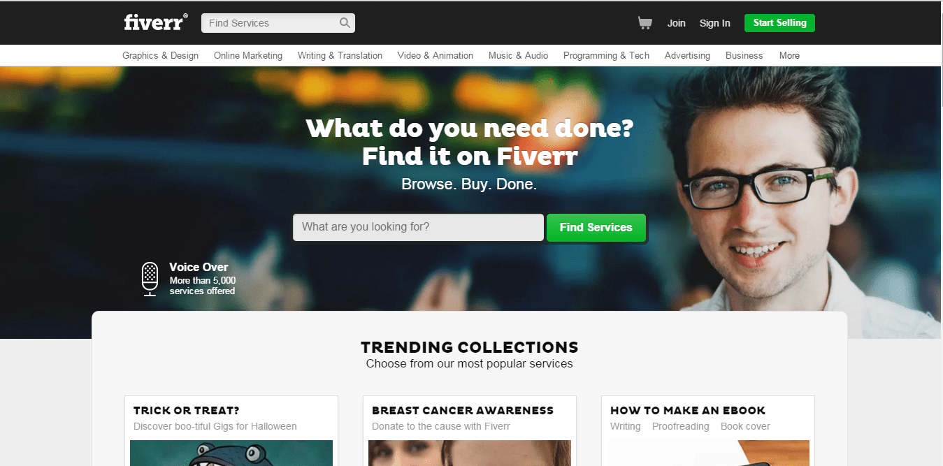 With Fiverr, we may trade our services opening at $5, which is the tagline and it is fairly precise. One can offer mainly anything according to their taste – create DIY projects or promotional videos, write and perform a poem, etc. Some basic categories offered through this platform are content writing and translation jobs, online marketing jobs, video and animation works, music creation, programing as well as graphic design.