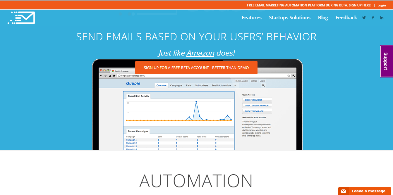 6. Guubie is an automated email marketing platform with low cost for startups, which allow startups to send targeted emails based on users’ behavior just like Amazon does, including responsive landing pages to generate leads and responsive email campaign to engage with your users or customers. Currently this app running in beta version you can sign up and get started with Guubie.